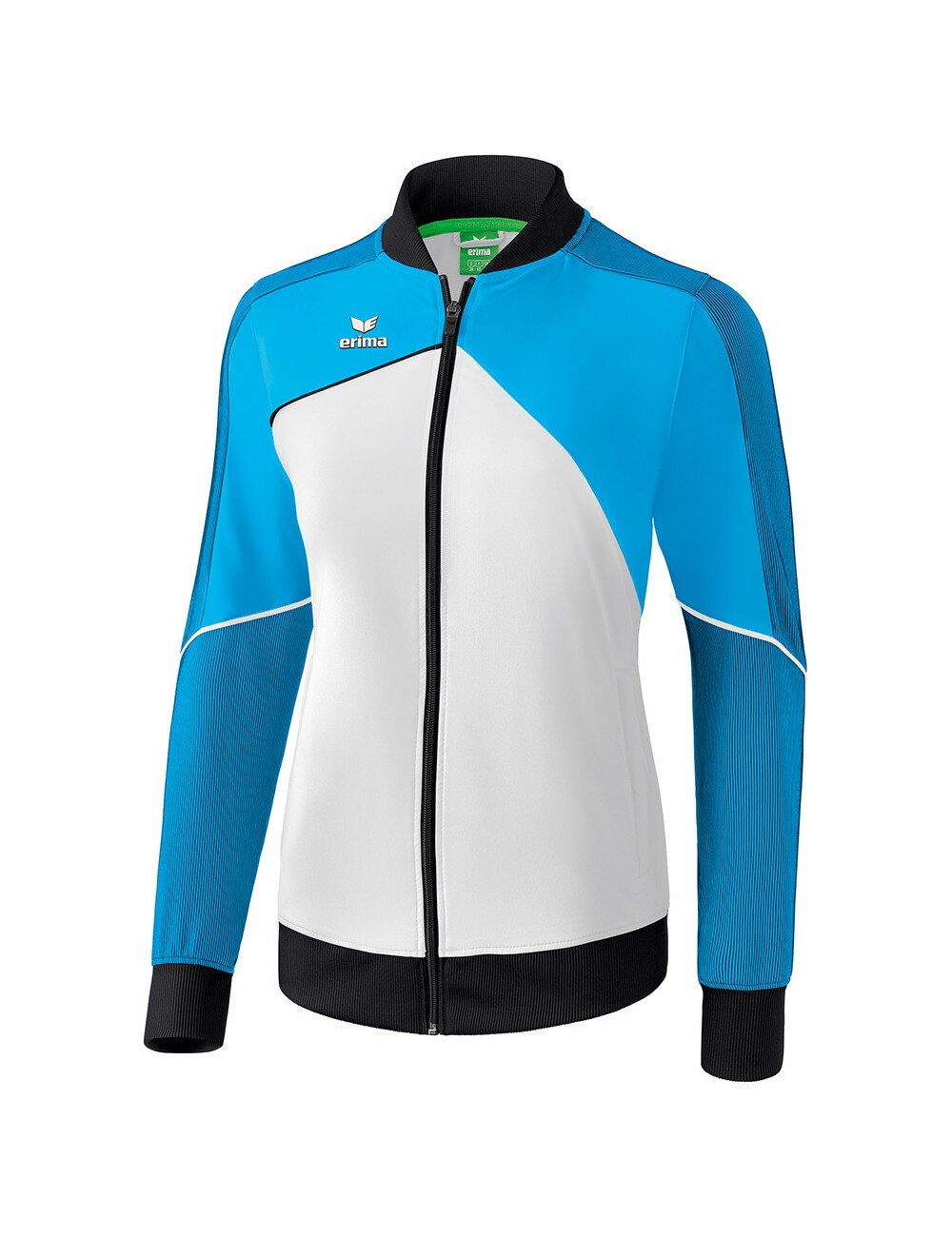 Pour en finir avec les vestes de présentation classiques. Matière textile élastique, régulant l'humidité Empiècements en stretch sur les manches pour une plus grande liberté de mouvement Larges bords-côtes sur les manches et bas de veste Poches zippées latérales Col Teddy Sans doublure Coupe femme spécifique
